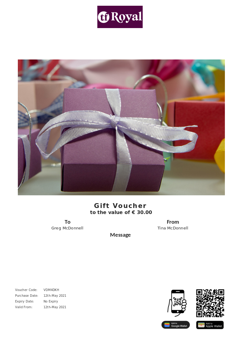 TF Royal Hotel & Theatre allows you to purchase instantly printable gift vouchers, special offers and tickets using the Voucher Connect platform.